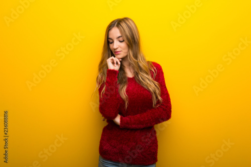 woman, beautiful, girl, hispanic, model, pretty, person, adult, attractive, caucasian, people, young, woman, casual attire, portrait, lady, female, elegant, beauty, blond, racked, red, background, yellow, wall, down, looking, thoughtful, head, face, look, thinks, thinking, eye, concept
