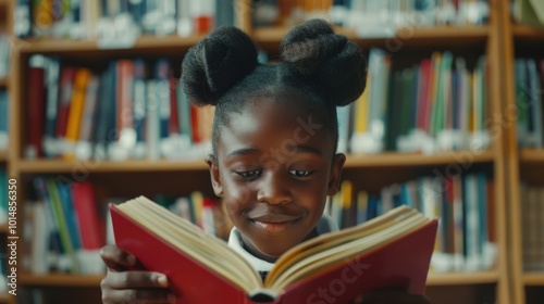 Young girl sitting at a table in a library, reading a book