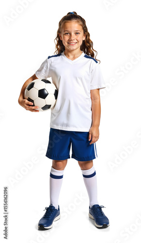 soccer, football, children, young, player, isolated, sport, standing, girl, caucasian, ball, children, portrait, holding, teenage, preteen, smiling, happy, jersey, cut-out, full, transparent, pose, studio, football player