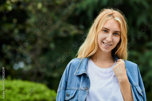 girl, jean, jacket, denim, young, hair, curly, concept, happiness, beautiful, outdoors, pretty, park, lifestyle, summer, model, spring, long, nature, background, woman, portrait, happy, joy, cute, female, person, green, short, white, t-shirt, blond, smile, nice, forest, tree, smiling, closeup, head shot, horizontal, pose, racked, look, trip, walk, traveler, blurred, against
