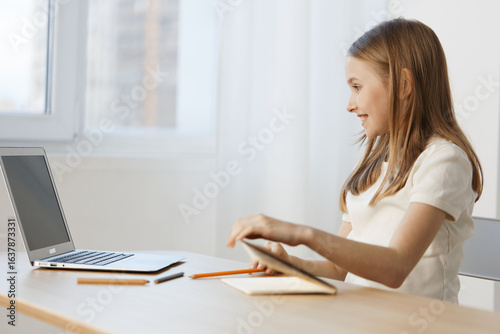 Young girl studying at a desk using a laptop, smiling with excitement Bright, light background enhances the learning atmosphere and youthful energy