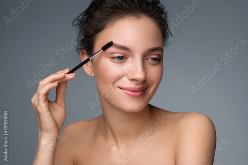 Young girl using brush for eyebrows. Photo of woman with perfect makeup on gray background. Beauty and Skin care concept.