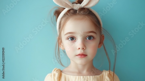 Young girl wearing a bunny ear headband against a blue background, showcasing innocence and playful charm with soft facial features.