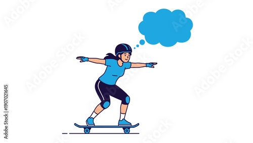 skateboard, girl, riding, sport, active, hobby, thought bubble, dream, thinking, safety, helmet, pad, youth, skater, street, exercise, lifestyle, movement, balance, skill, fun, recreation, outdoors, leisure, vector, illustration, character, female, empowerment, action, motion, speed, goal, plan, idea, inspiration, creative, simple, minimalist, blue, white, equipment, athletic, urban, teenage