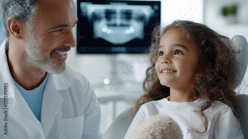 children, dentist, girl, consultation, dental care, health care, smile, medicine, doctor, patient, interaction, comfort, stuffed toy, chart, explanation, tool, x-ray, professional, care, attentive, learning, childhood, healthcare professional, trust, supportive, image, clean, hygiene, expertise, exam, comforting, bright, cheerful, warm, friendliness, clinic, appointment, service, discussing, equipment
