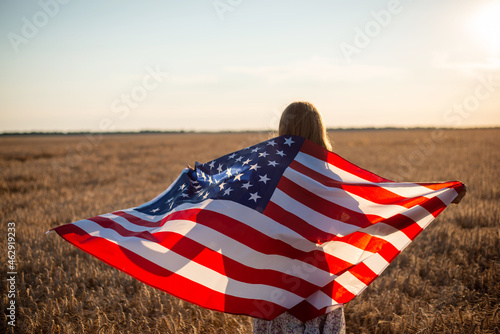 Young girl with flag of USA in the field of rye. Endless grain field in the evening with a girl having a walk with a flag