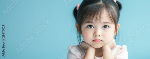Young girl with pigtails gazing upward against a soft blue background