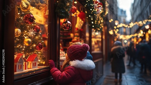 christmas, children, holiday, decoration, festive, light, evening, city, magic, wonder, window shopping, christmas tree, ornament, celebration, winter, warm clothes, tradition, joy, street, family time, cosy, urban setting, twinkling, garland, chaplet, excitement, childhood, seasonal, december, downtown, holiday lights, snow, christmas ornament, exploration