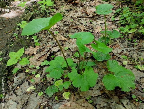 Young green leaves of burdock on the background of soil covered with fallen oak leaves. Natural backgrounds with plants.