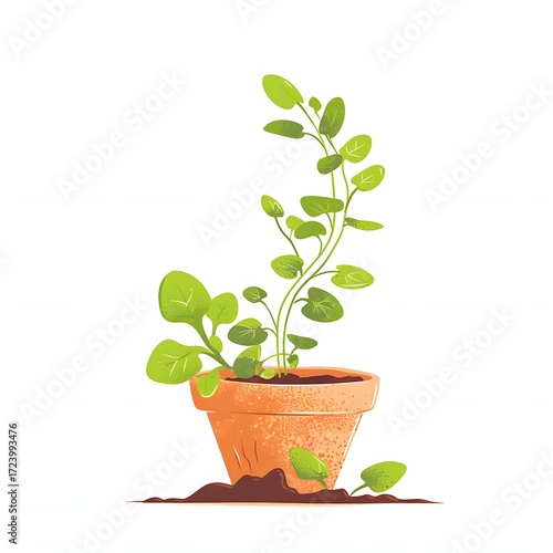 Young green plant growing in clay pot with soil, eco friendly home gardening, natural lifestyle illustration, sustainable indoor planting