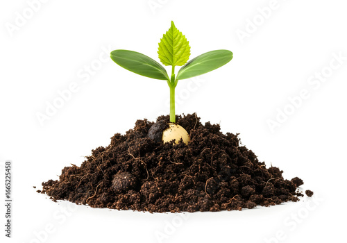 Young Green Plant Sprouting from Soil Isolated on White Background