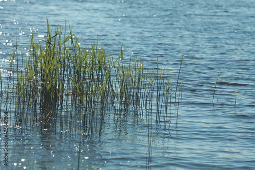 young green reed stalks grown in shallow water lit by the sun's rays
