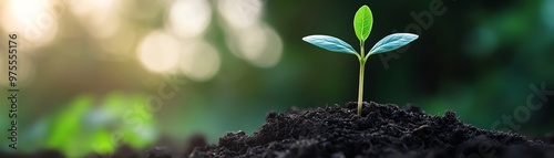 Young green seedling growing from the rich soil with soft sunlight, symbolizing new life and growth in a nature setting.