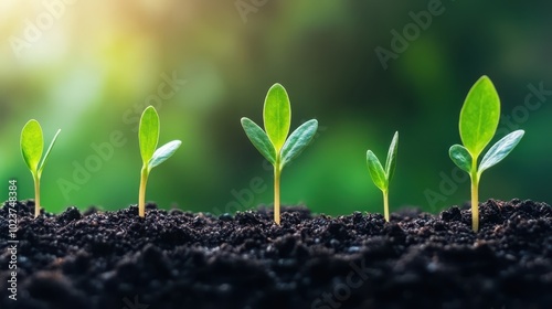 Young green seedlings emerging from rich soil, bathed in warm sunlight. Growth, sustainability, and nature concept.
