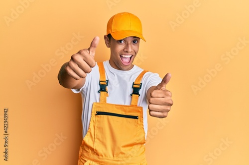Young handsome african american man wearing handyman uniform over yellow background approving doing positive gesture with hand, thumbs up smiling and happy for success. winner gesture.