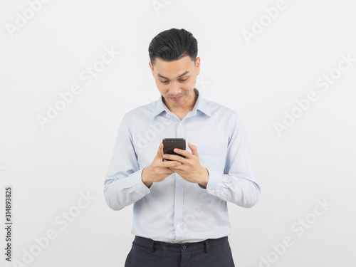 Young handsome asian business man playing smartphone with smiling isolated on white background.