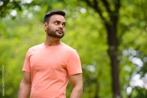 Young handsome bearded Indian man at the park