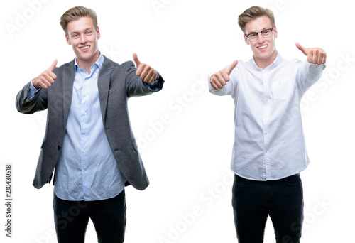 Young handsome blond business man wearing different outfits approving doing positive gesture with hand, thumbs up smiling and happy for success. Looking at the camera, winner gesture.