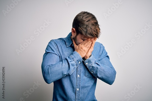 Young handsome blond man with beard and blue eyes wearing casual denim shirt with sad expression covering face with hands while crying. Depression concept.