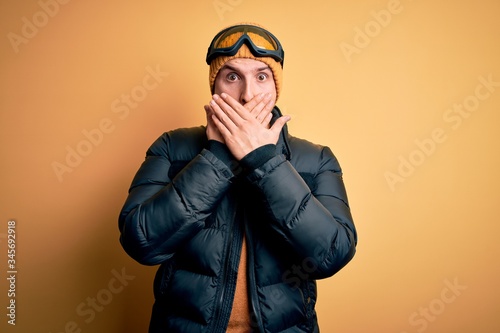 Young handsome caucasian man wearing hat, coat and ski glasses for winter and snow weather shocked covering mouth with hands for mistake. Secret concept.
