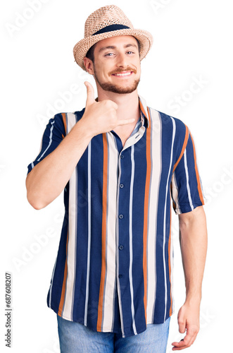 Young handsome caucasian man wearing summer hat smiling doing phone gesture with hand and fingers like talking on the telephone. communicating concepts.