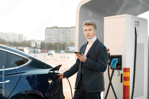Young handsome confident Caucasian businessman, holding plug connector with socket in hands, charging his luxury electric car at city station