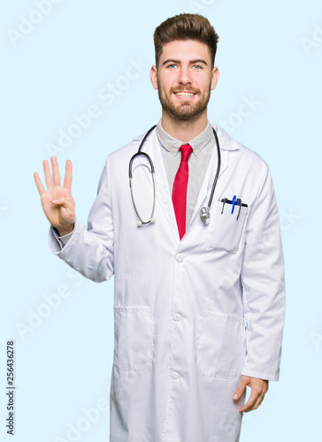 Young handsome doctor man wearing medical coat showing and pointing up with fingers number four while smiling confident and happy.