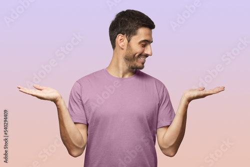 2, hand, choice, male, man, product, isolated, young, happy, business, showing, copy space, work, decision, balance, promotion, purple, background, attractive, solution, gesticulate, lifestyle, presentation, offering, confident, student, choose, people, gradient, advertising, advertisement, smile, holding, palm, smiling, presenting, option, person, displaying, demonstrating, choosing, portrait, model, empty, palm, sale, pecking, option, pink