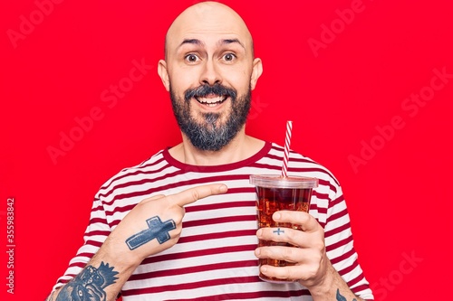 Young handsome man drinking glass of cola beverage smiling happy pointing with hand and finger