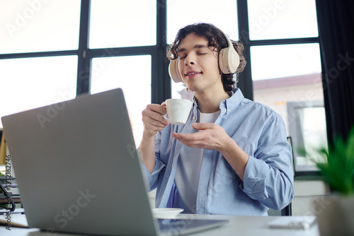 man, photogenic, young, office, work, good-looking, job, attractive, drink, hot drink, music, earphones, modern, laptop, joyful, casual attire, workspace, concentration, presentation, relaxation, productivity, listening, focused, ambience, stylish, cheerful, digital, employee, creative, environment, professional, lifestyle, technology, youth, business, charming, satisfied, desk, home, friendly, enjoyment, leisure, serene, key