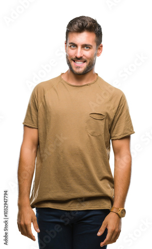Young handsome man over isolated background looking away to side with smile on face, natural expression. Laughing confident.