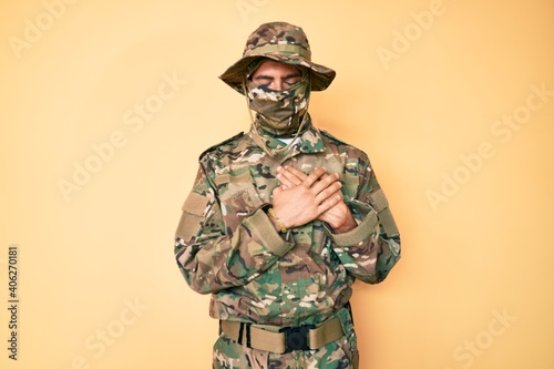 Young handsome man wearing camouflage army uniform and balaclava smiling with hands on chest with closed eyes and grateful gesture on face. health concept.