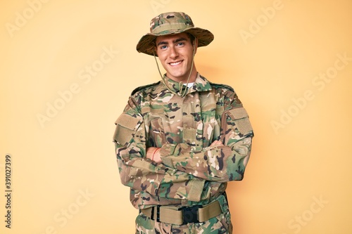 Young handsome man wearing camouflage army uniform happy face smiling with crossed arms looking at the camera. positive person.
