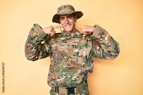 Young handsome man wearing camouflage army uniform smiling cheerful showing and pointing with fingers teeth and mouth. dental health concept.