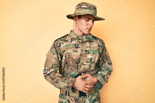 Young handsome man wearing camouflage army uniform with hand on stomach because indigestion, painful illness feeling unwell. ache concept.
