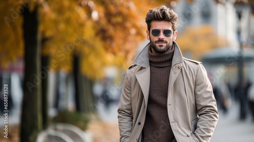 Young handsome man wearing coat and sunglasses walking in the city at autumn day