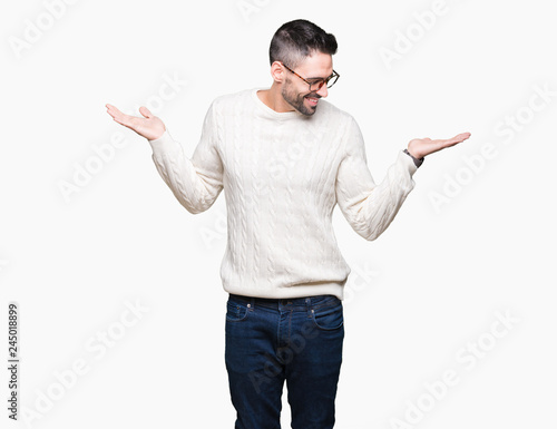 Young handsome man wearing glasses over isolated background Smiling showing both hands open palms, presenting and advertising comparison and balance