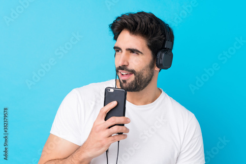 Young handsome man with beard over isolated blue background listening music with a mobile and singing