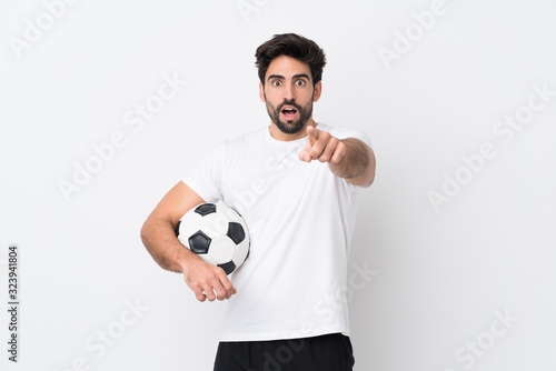 man, man, people, person, male, guy, photogenic, young, adult, caucasian, beard, isolated, white, soccer, player, football, ball, sport, athlete, playing, professional, training, athletic, game, competition, activewear, leisure, surprised, shock, expression, pointing, front, concept, eye, finger, gesture, look, you