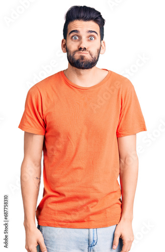 Young handsome man with beard wearing casual t-shirt puffing cheeks with funny face. mouth inflated with air, crazy expression.