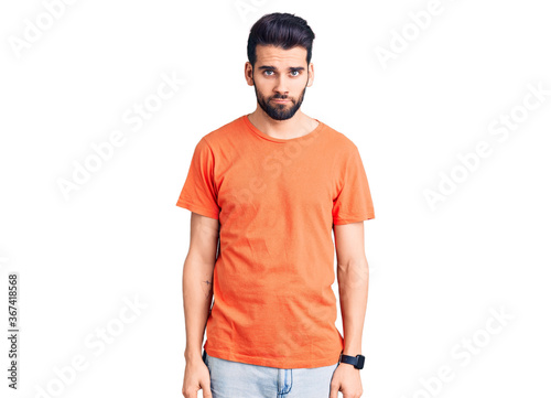 Young handsome man with beard wearing casual t-shirt skeptic and nervous, frowning upset because of problem. negative person.