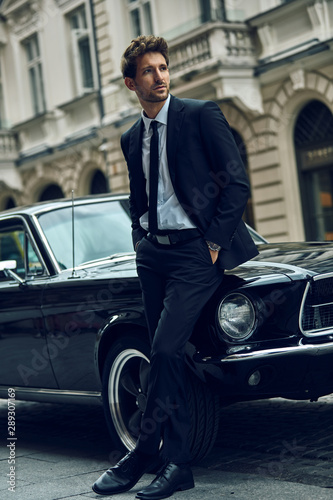 Young handsome man with black classic car wearing black suit with hands in pocket