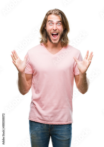 Young handsome man with long hair over isolated background celebrating crazy and amazed for success with arms raised and open eyes screaming excited. Winner concept