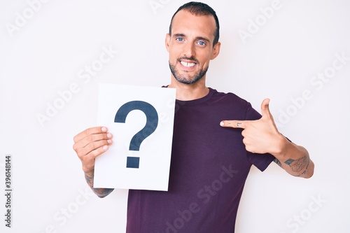 Young handsome man with tattoo holding question mark pointing finger to one self smiling happy and proud