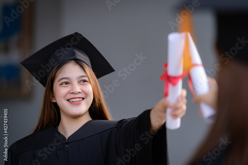 Young happy Asian woman university graduates in graduation gown and mortarboard hold a degree certificate celebrate education achievement in the university campus. Education stock photo