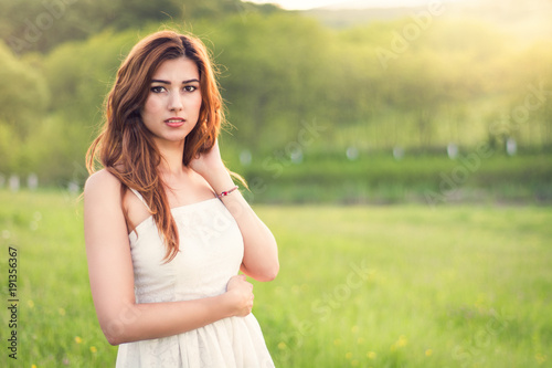 Young happy attractive woman posing in sunset