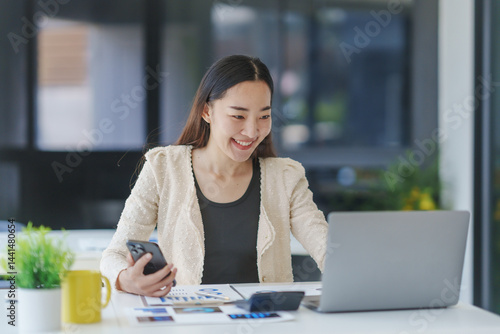 business, woman, office, laptop, computer, work, working, technology, businesswoman, desk, smartphone, cyberspace, professional, communication, female, happy, smiling, success, career, online, finance, marketing, corporate, executive, manager, entrepreneur, mobile phone, phone, mobile, device, connection, workplace, modern, interior, design, chart, graph, analysis, datum, strategy, planning, project, task, information, research, cheerful, youth, adult, asian