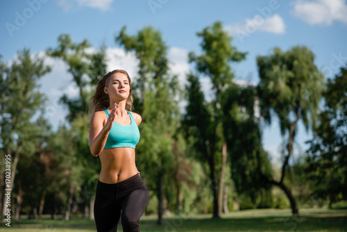 Young happy female runner running in city park. Healthy fitness woman jogging outdoors. Forest in background.