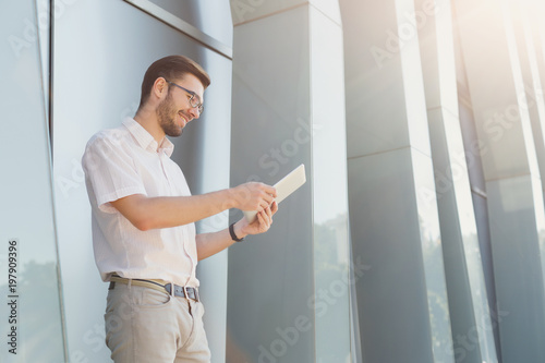 adult, building, business, businessman, businessperson, court, device, digital, finance, government, law, lawyer, legal, lifestyle, male, man, occupation, office, outdoors, person, professional, smart, solicitor, standing, success, working, eyeglass, capital, copy space, holding, reading, contract, tablet, computer, technology, smiling, happy, content, contraption, looking, young, wall, beard, caucasian
