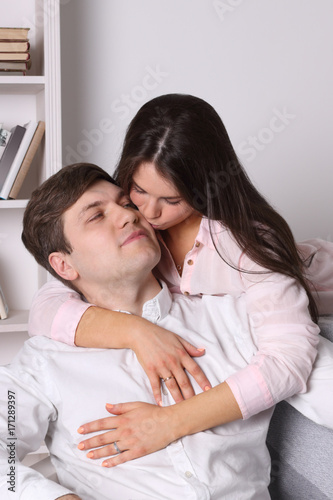 adult, armchair, attractive, beautiful, book, boyfriend, casual attire, caucasian, cheerful, couple, cute, face, female, fun, girl, girlfriend, hand, happiness, happy, home, joy, kiss, lifestyle, living, love, man, married, man, people, person, portrait, pose, pretty, human relationships, relax, rest, room, shelf, shirt, shoulder, to sit, smile, smiling, studio, together, 2, white, woman, woman, young